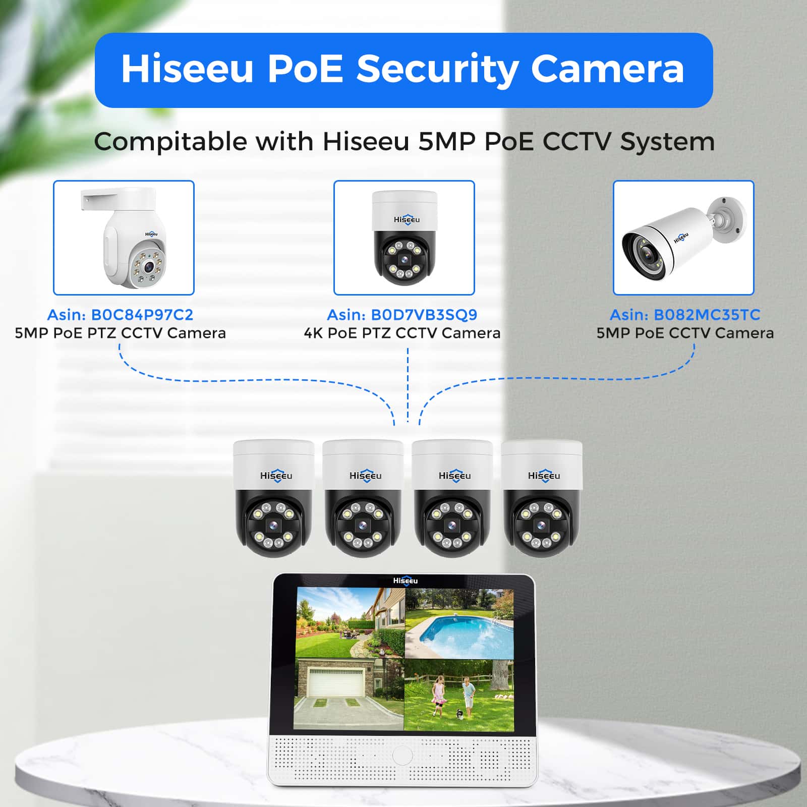 • [8MP HD PoE CCTV System] The Hiseeu 4k PoE CCTV wired system is the all in one system. Desigend with 12'' LCD HD monitor(It's the NVR box too) and 8 megapixels HD PoE PTZ cameras, it provides you with super HD pictures and you will never miss any details with the Hiseeu PoE CCTV system.