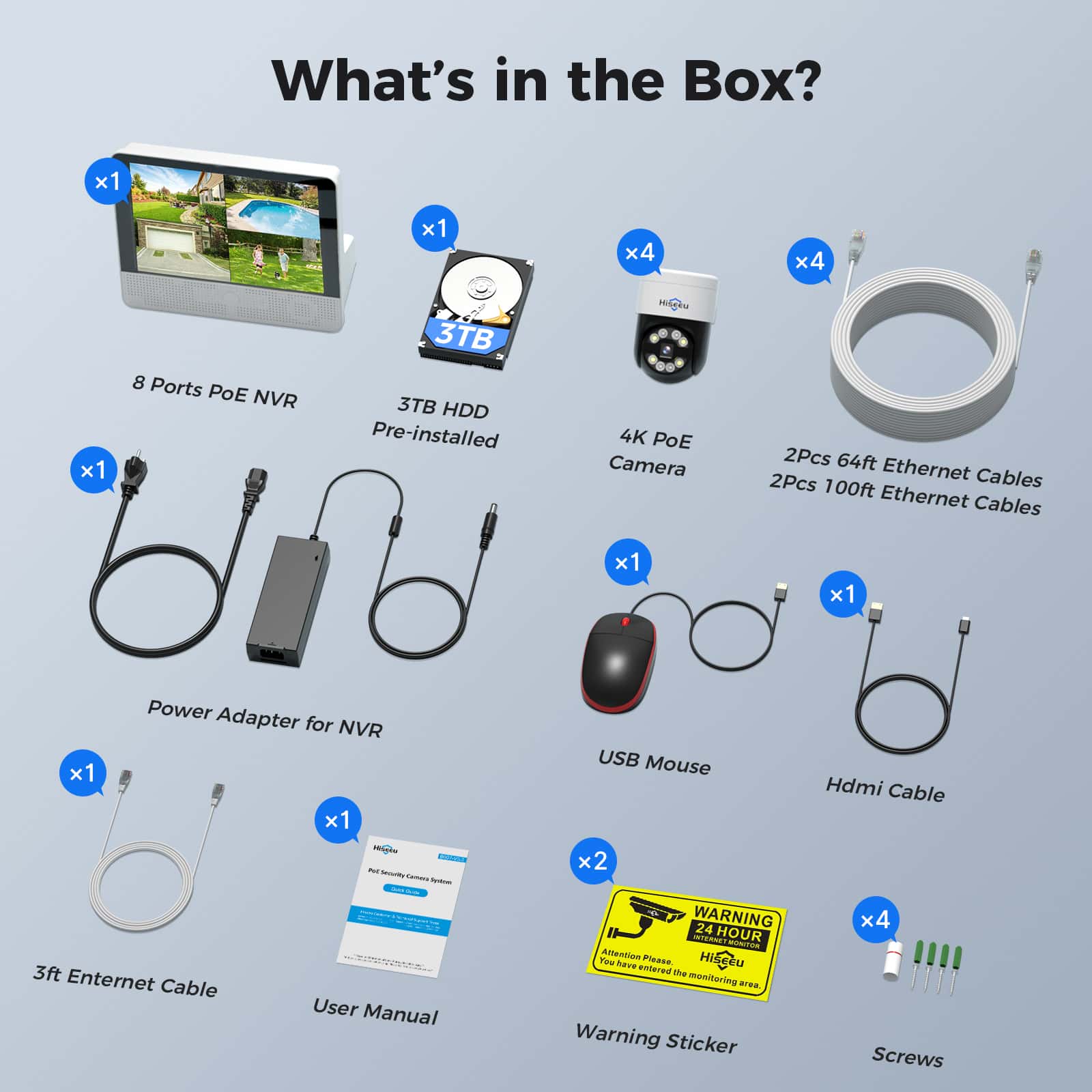 • [Plug and Play PoE System] The Hiseeu 4K PoE security camera system contained the 60ft network cables from the video surveillance kit and connect the security cameras to the NVR ports, you can see the security camera system working with videos immediately on the HD LCD monitor. It is true Plug and Play camera kit.