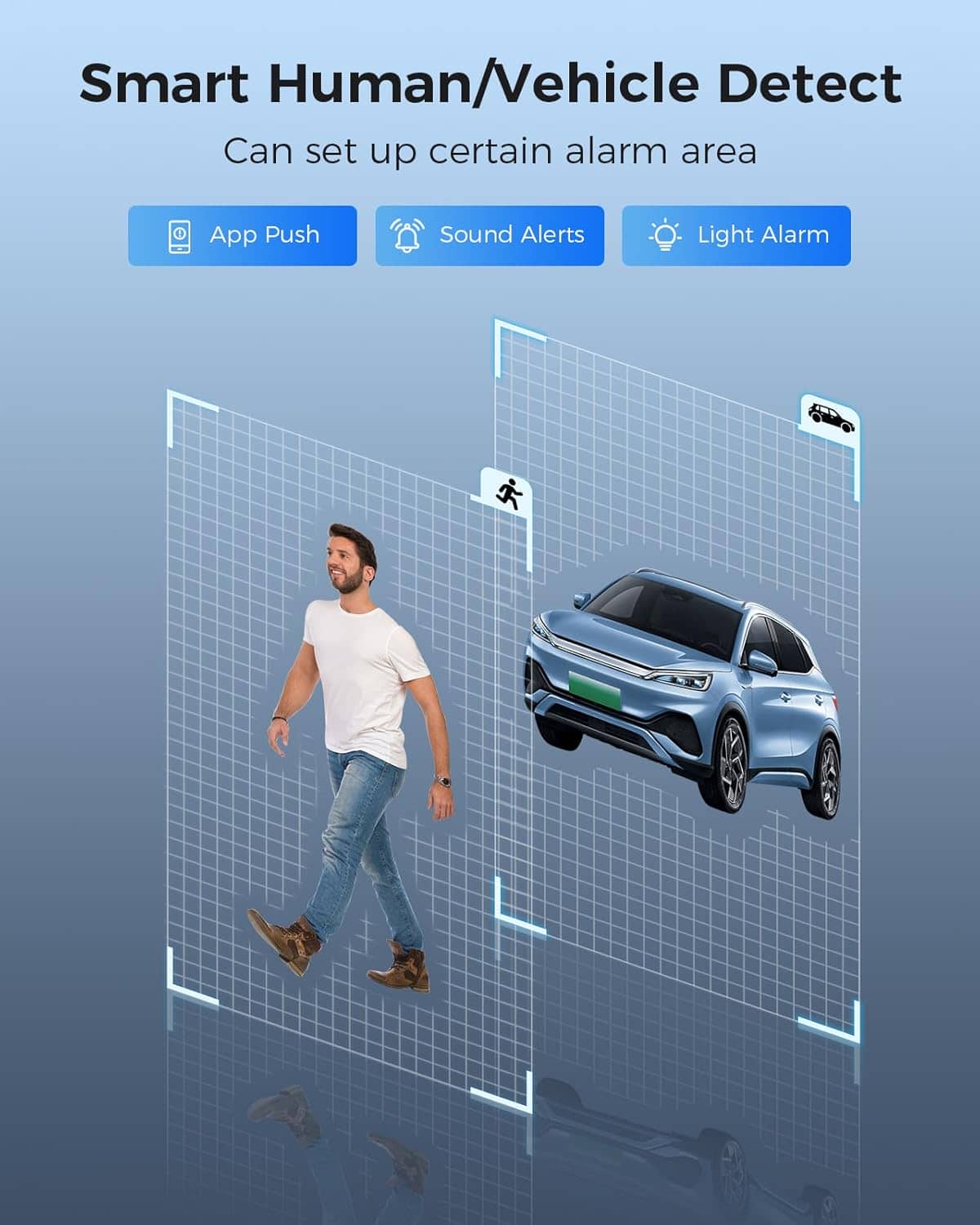 • 【AI Tech for Human/Vehicle Detect 】Setting alarm rules like customizing area to catch suspicious person or protecting cars outdoor