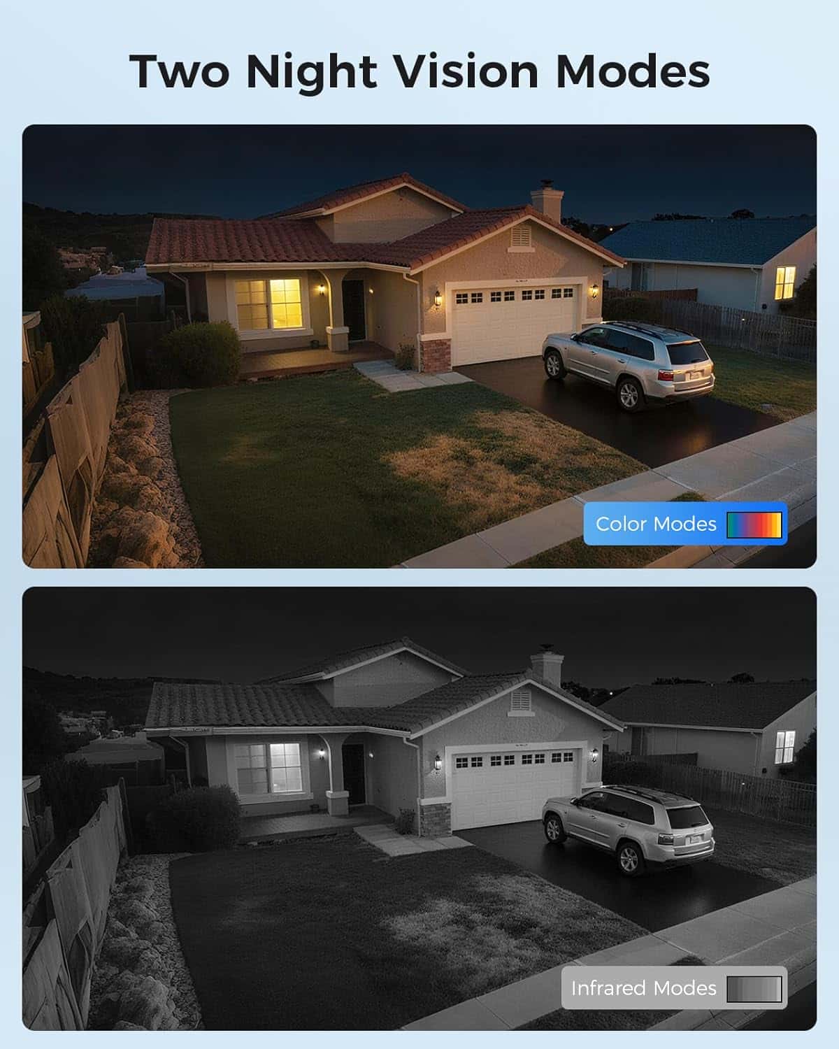 • 【Color Night Vision】 Three Night Vision Modes: 1.Black-and-White 2.Color Night Mode 3. Alarm Light (Only the light will be on when detecting suspicious objects)